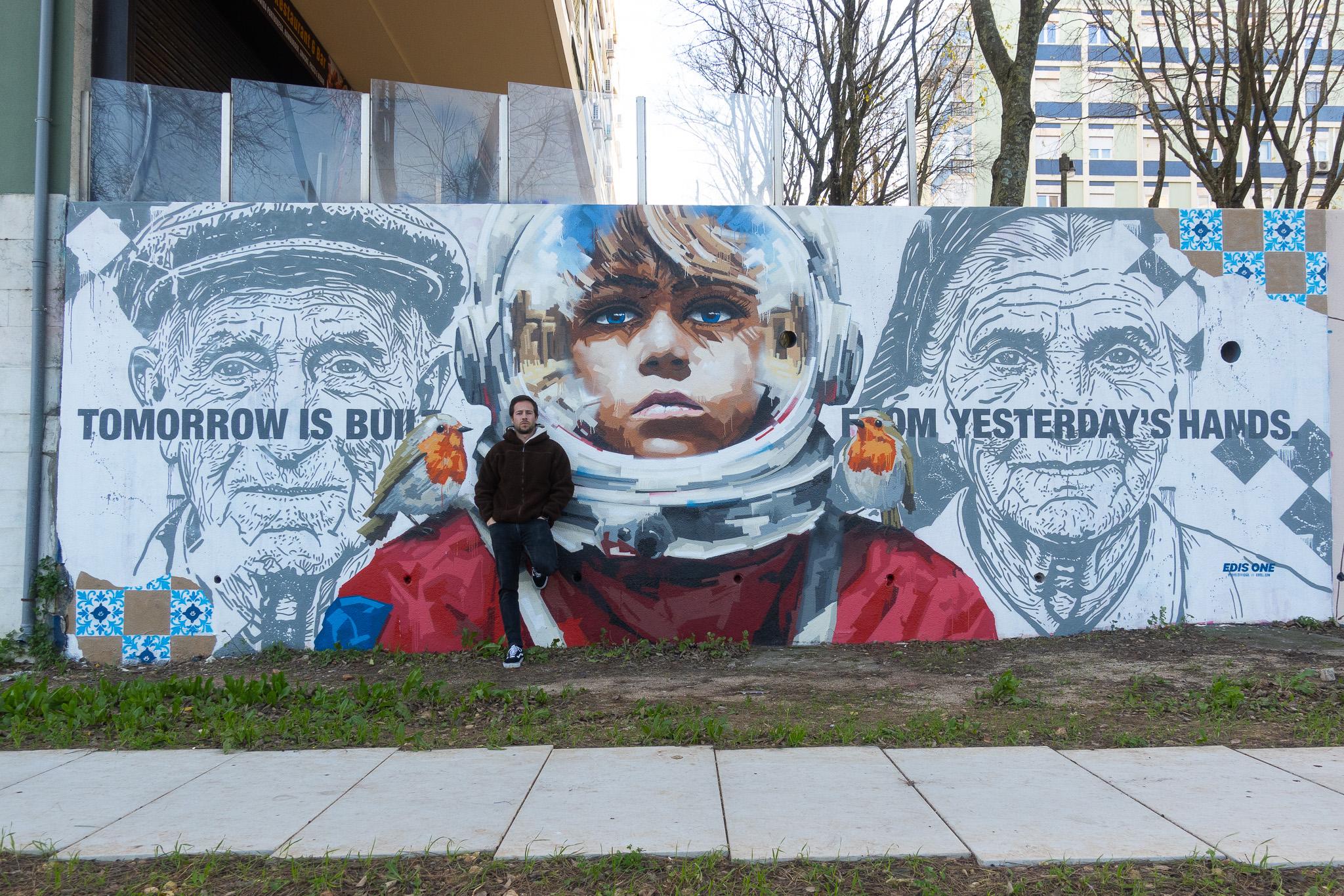 Our Future, Their Hands explores the direct relationship between past, present, and future. At the center of the mural, a child wearing an astronaut helmet represents the future — still undefined, fragile, yet full of potential. The child’s direct gaze confronts the viewer with a shared responsibility for what lies ahead.